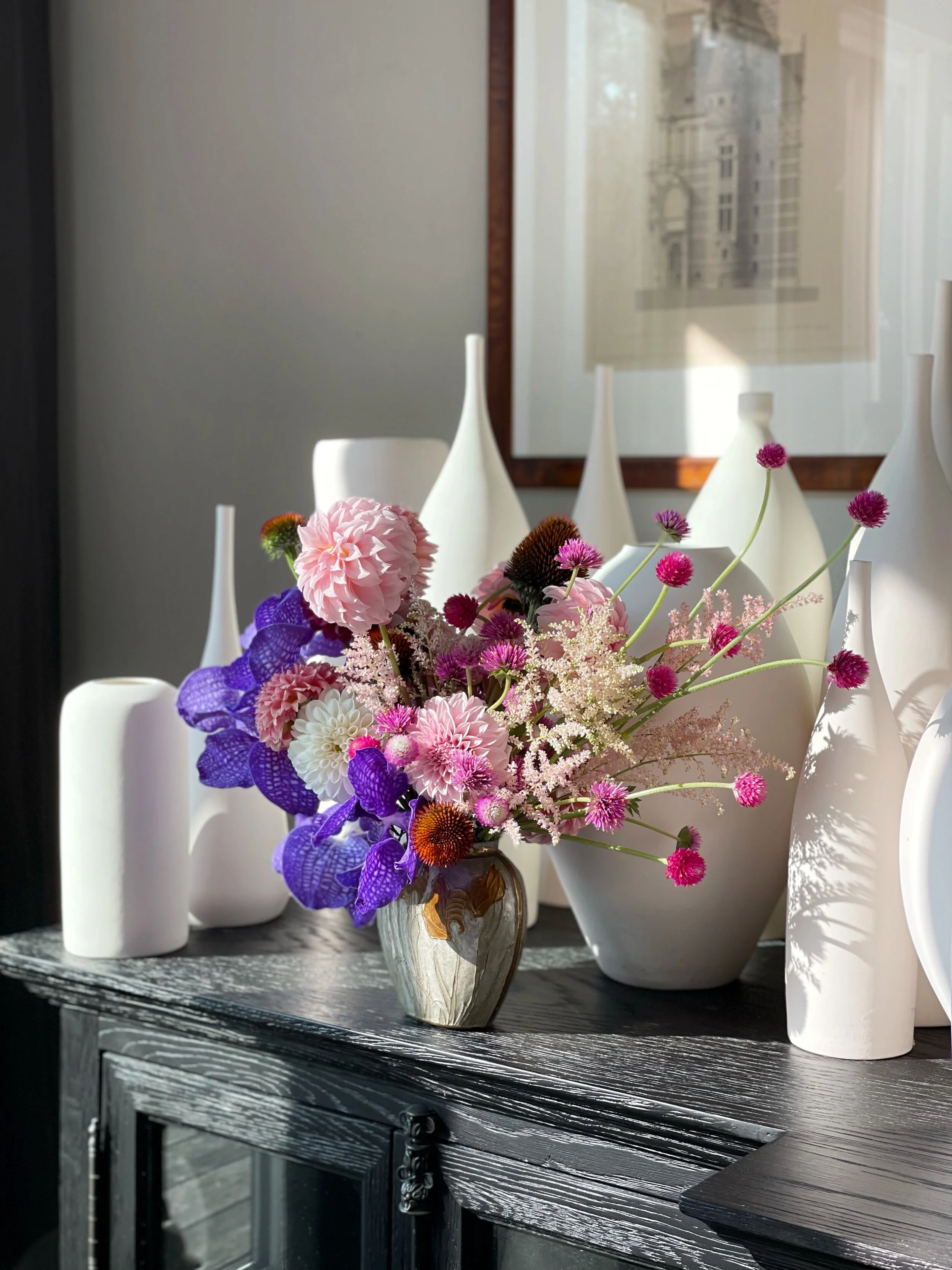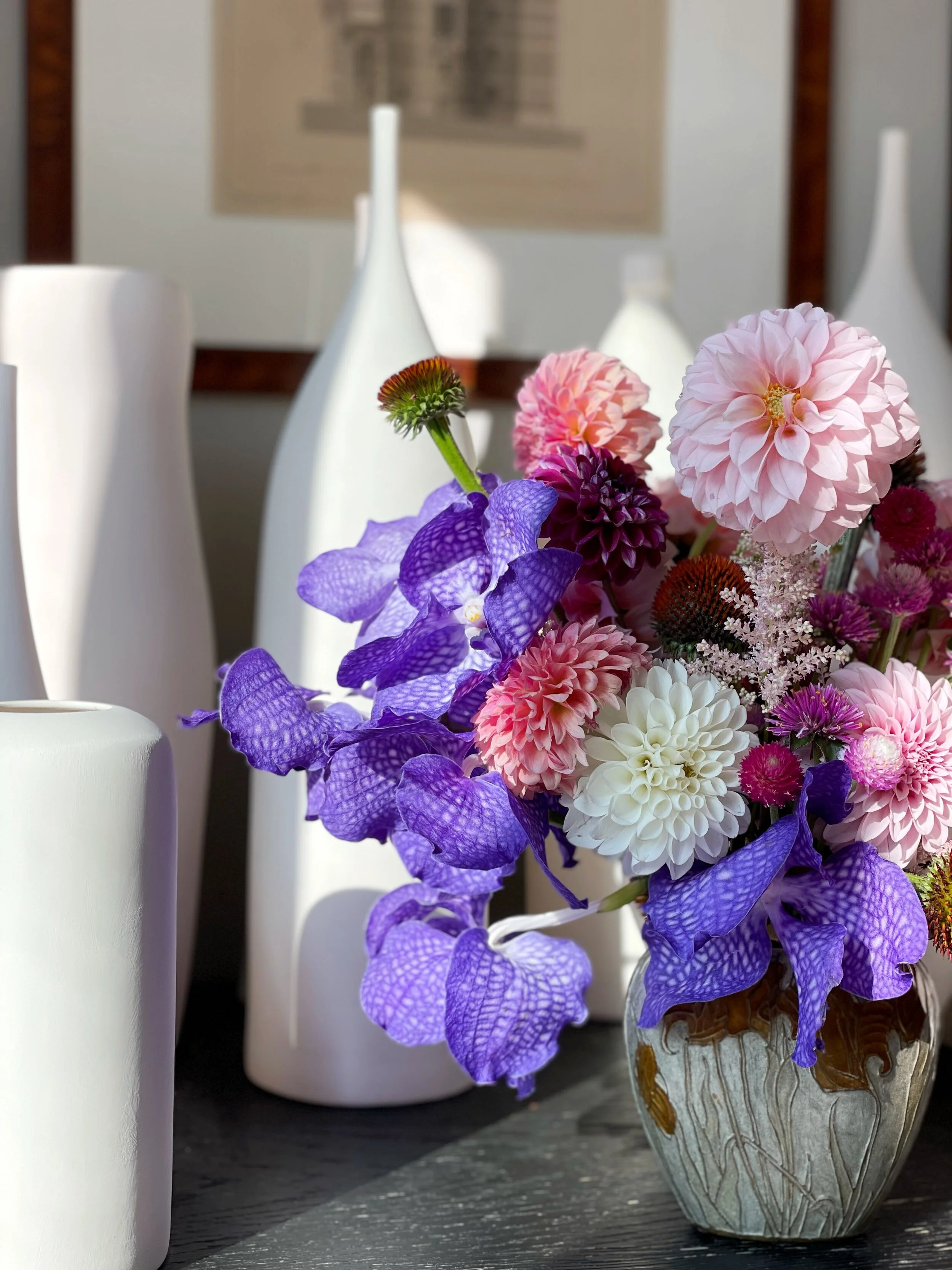 What way to better celebrate a friend than with a showy, floral display. This small but mighty arrangement packs a punch in bold, jewel toned petals. Layers of mixed dahlias, echinacea pods, and blush astilbe fill the body of this sculptural piece and a stately peacock tail in mixed gomphrena for a “grab your attention” finish. An intoxicating purple vanda orchid balances the arrangement for a proper peacock floral execution.